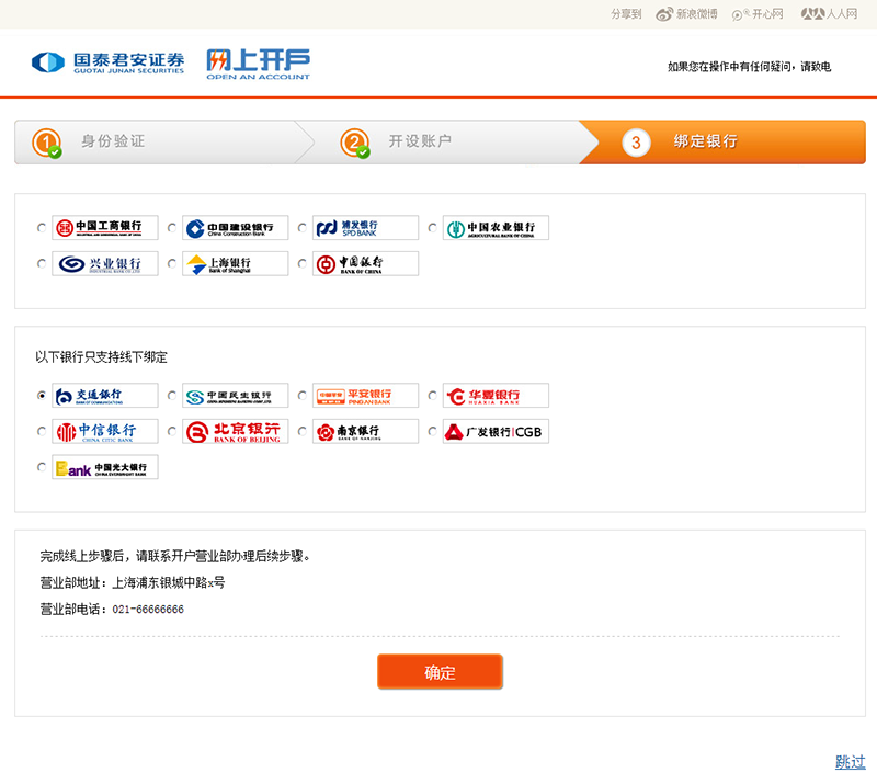 10. 绑定银行卡 1)用户需选择一家银行卡进行绑定操作,每家银行的绑定方式略有不同。用户也可以选择跳过绑定银行卡步骤。 3)建设银行:需要先点击“去网银签约”。然后在弹出的提示中点击确定。 4)浦发银行:需要先输入银行卡账号和图片验证码,再点击“去网银签约”或“打电话签约”。 5)农业银行:需要先输入银行卡账号和图片验证码,再点击“确定”。 6)兴业银行:需要先输入银行卡账号、取款密码和图片验证码,再点击“确定”。 7)上海银行:需要先输入银行卡账号和图片验证码,再点击“确定”。 8)中国银行:需要先输入银行卡账号,电话银行密码和图片验证码,再点击“确定”。 9)用户也可以选择以下线下银行,但需要去营业部办理后续手续。