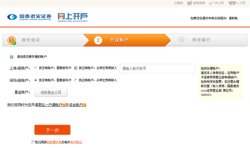 8. 开设账户——选择账户 1)用户可根据自身情况,选择新开户或转户。选择转户时,还需要输入股东账号。 3)选择完成后,点击“下一步”按钮,开始设置密码。