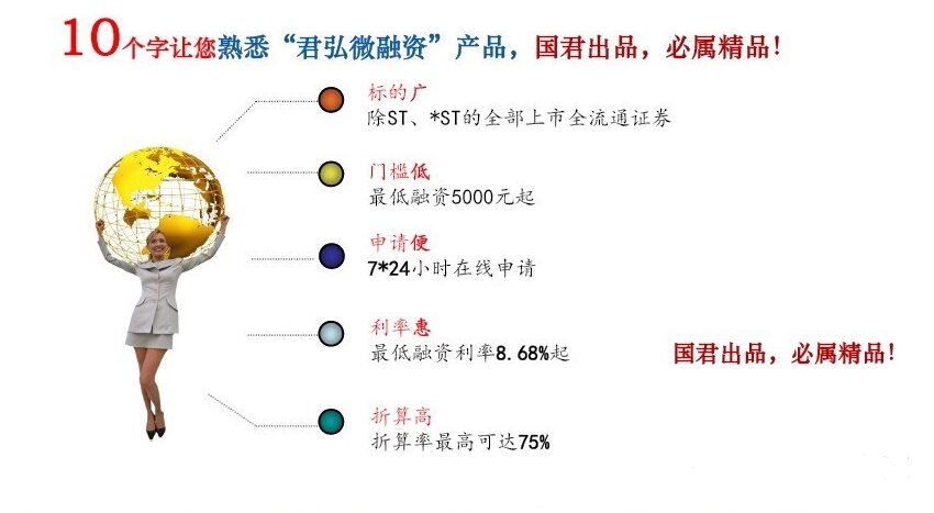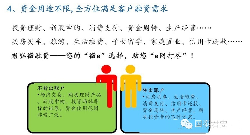 3、资金用途不限,全面满足客户需求:买房买车、投资理财、生活消费、在线支付、新股申购、生产经营、资金周转, 君弘微融资助您一网打尽。