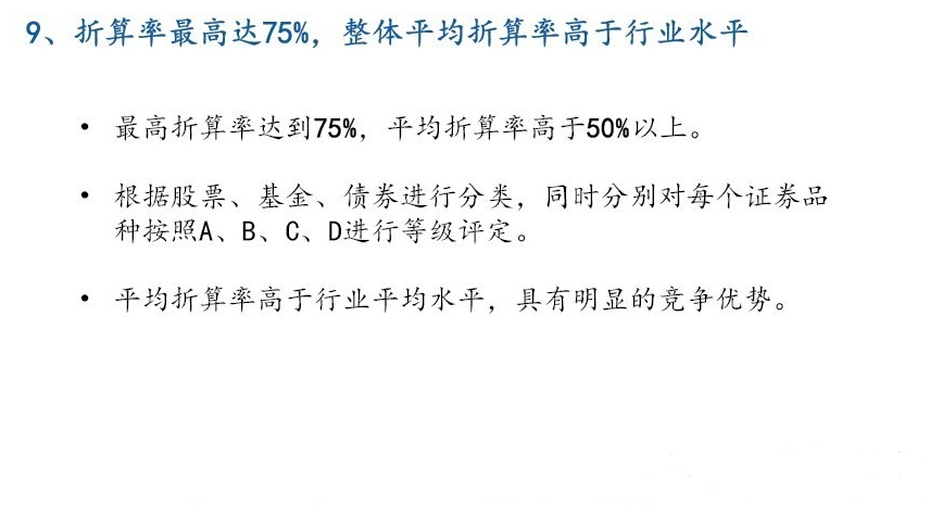 8、整体平均折算率高于行业水平:最高折算率达到75%,平均折算率50%以上。