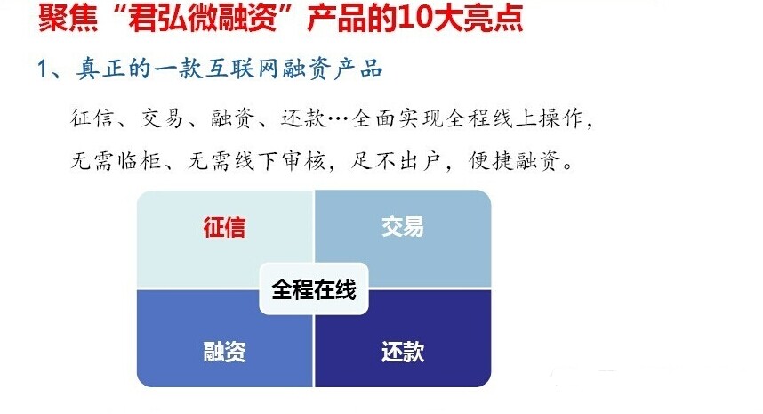 1、真正的一款互联网融资产品:征信、交易、融资、还款…全面实现全程线上操作,无需临柜、无需线下审核,足不出户,便捷融资。