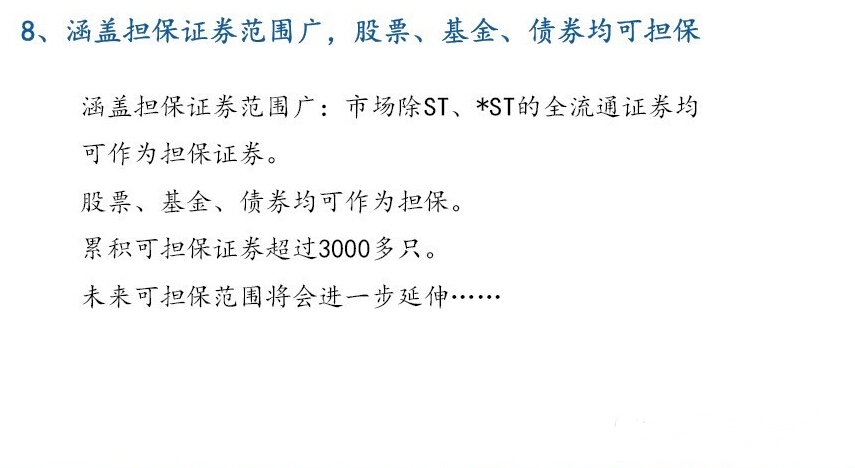 7、涵盖担保证券范围广:市场除ST、*ST的全流通证券均可作为担保证券。