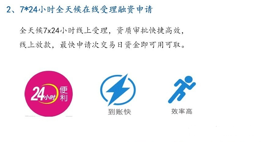 2、全天候在线受理资质申请:全天候7x24小时线上受理,资质审批快捷高效,线上放款,申请次交易日资金即可用可取。
