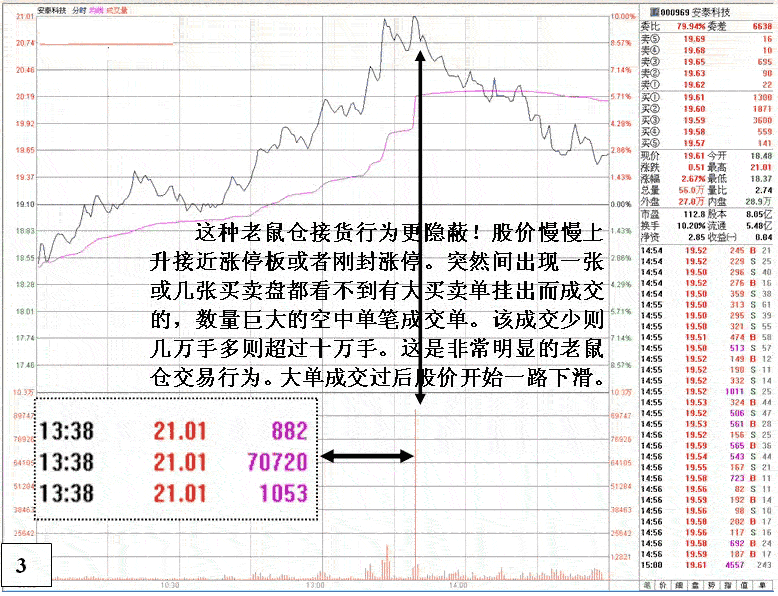如某基金重仓买入一个股票,投入资金过亿甚至几个亿。对于一个中小盘股而言,在该基金买入的整个过程中,股价必将受到资金源源流入影响而上涨。操盘手在建仓买入时可以通过控制买入数量和节奏,一定程度上可避免影响价格上升过快。同样,如果操盘手另有目的希望股价在其管理帐户买入期间,令股价明显大幅上升。通过加快买入节奏或大手笔暴力买进,就很容易令股价在短期内大幅走高。老鼠仓先于基金帐户买入,此时相当于拿其管理的基金帐户资金去为老鼠仓筹码抬轿。这是现实老鼠仓稳赚不赔的不道德谋利手段。