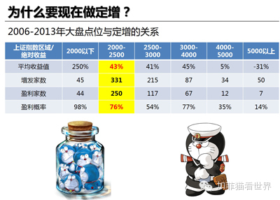 第一,至少从上面的数据看,定增的收益很不错,而且确实是点位越低,获利概率和收益率越高。怪不得很多土豪……不好意思,都是大客户,这么说不太好……怪不得很多“继承者们”一段时期以来动不动就拿个几千万问你们能不能给定增融资?