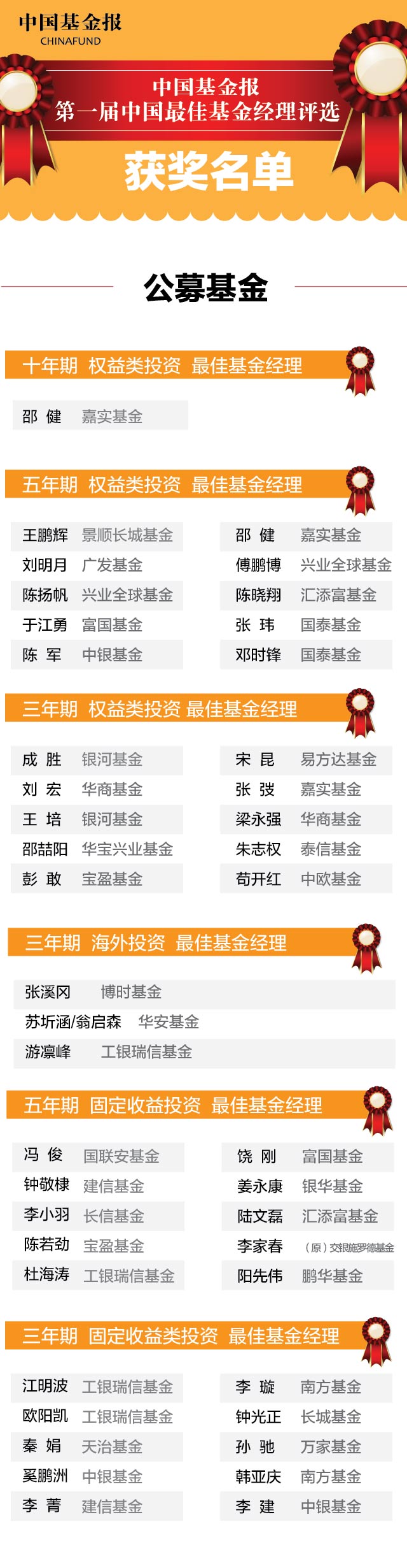 本次评选面向公募基金经理、私募投资经理和券商集合理财投资主办分别设置奖项。公募基金方面,嘉实基金邵健获评分量最重的“十年期最佳基金经理”,银河基金成胜等10位基金经理获评“三年期权益类投资最佳基金经理”,景顺长城基金王鹏辉等10位基金经理获评“五年期权益类投资最佳基金经理”,工银瑞信基金江明波等10位基金经理获评“三年期固定收益投资最佳基金经理”,国联安基金冯俊等10位基金经理获评“五年期固定收益类投资最佳基金经理”,博时基金张溪冈等3位基金经理获评“三年期海外投资最佳基金经理”。
