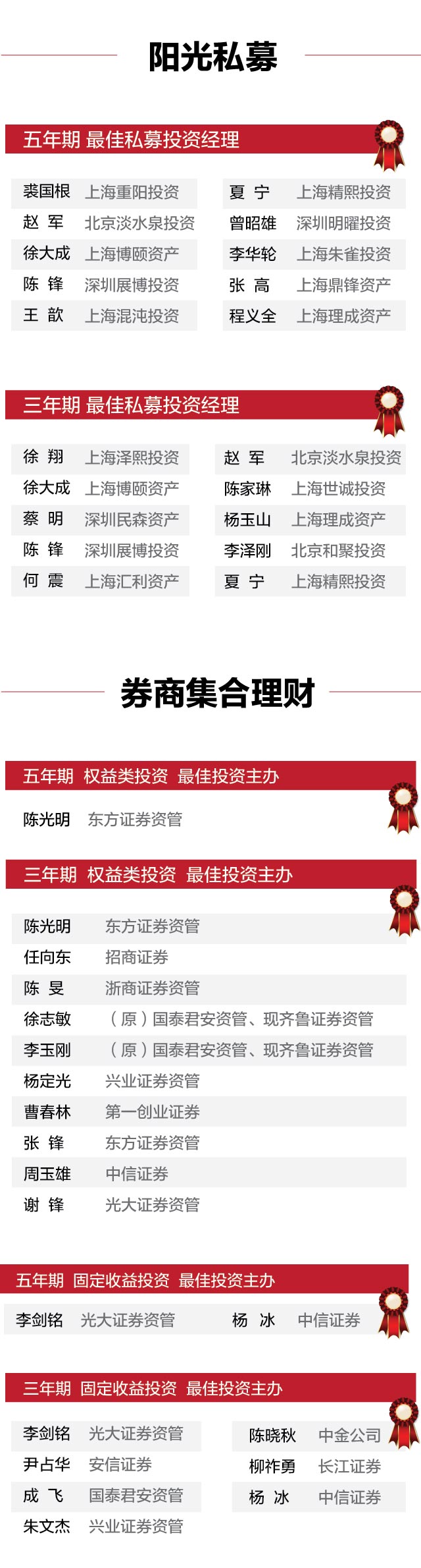 券商集合理财方面,上海东方证券资管陈光明等10位获评“三年期权益类投资最佳投资主办”、上海东方证券资管陈光明独自拿下“五年期权益类投资最佳投资主办”,光大证券资管李剑铭等7位获评“三年期固定收益投资最佳投资主办”,光大证券资管李剑铭和中信证券杨冰等2位获评“五年期固定收益投资最佳投资主办”。