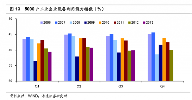 而回到我国,5000户工业企业设备利用能力指数显示出我国的产能过剩情况不容乐观,根据工信部13年的《工业信息业运行报告》,当前我国传统的钢铁、有色、建材、化工等行业已经产能过剩,并且过剩状况逐渐向光伏、风电等新兴产业拓展。