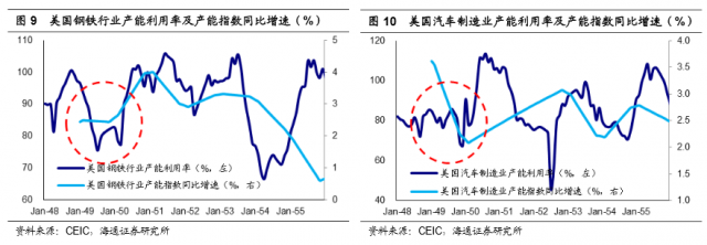 美国制造业产能利用率反弹,产能并未坍缩。以美国钢铁和汽车产业为例,其产能利用率在 1948年后大幅下滑,行业总产能也出现增速大幅放缓的迹象。而在马歇尔计划实施一年后,这两个行业的产能利用率大幅回升,并在计划实施期间维持在较高水平,行业总产能也出现加速扩张的迹象。