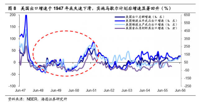 马歇尔计划实施后,美国制造业出口增速显著回升。受欧洲经济下滑拖累,美国制造业出口增速自1947年10月起失速下滑。而在马歇尔计划启动半年后,美国出口增速触底反弹,并在整个计划实施期间不断走高。