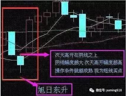 股票和大盘经过连续暴跌之后,K线组合一般是以“三只乌鸦”的形式进行调整,以中长阴小阴连续调整,在空头力量即将竭尽时,多头在第二天乘虚反扑将股价跳空高开,收出一根光头光脚的中长阳线,并且阳线是完全吞没阴线的。这种形态我们可以称之为“旭日东升”大家可以通过下图可以清晰的看到: