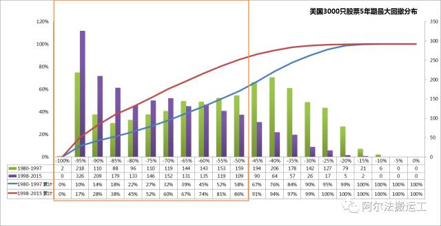 2. 1980年至1997年, 只有区区15%左右的股票大幅跑赢了大盘(累计涨幅超过大盘100%)!在1998年至2015年, 只有区区18%左右的股票大幅跑赢了大盘(累计涨幅超过大盘100%)!