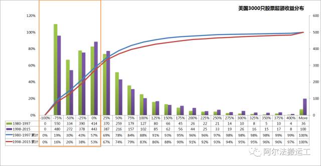 1. 有57%的股票在1980年至1997年内都没有跑赢大盘!相似的,有54%的股票在1998年至2015年内都没有跑赢大盘!