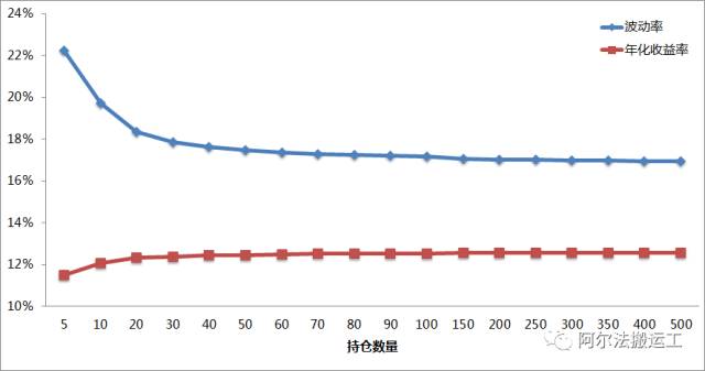 可以看出,随着持仓数量下降,资产组合的预期回报收益率和波动率(风险)都会上升。其中波动率上升速度较快,当持仓数量下降到20以下时,投资组合的波动率会大幅上升。而预期回报的增长速度,并没有波动率的增长速度快。