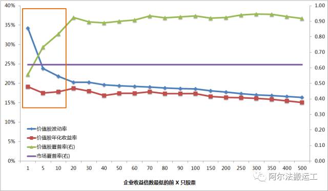 为了验证这个结论。我们在价值股的基础上做了另外一个测试。同样的在每个月初,我们只在企业收益倍数最低的前500只股票做选择。不同的是,我们不再随机组合成5只或者500只股票,我们在这500只价值股股票里,按照企业收益倍数高低,渐进式地选取最低的前1只,前5只,前10只,一直到前500只。