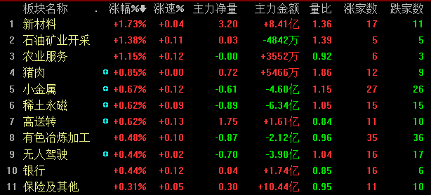 今天盘面上各个板块的表现与大盘一样,均是不温不火,板块的涨幅均较小。两市仅新材料、石油矿业、农业服务三个板块涨幅超1%,新材料板块涨幅稍大,上涨近2%;猪肉、小金属、稀土、高送转、有色、银行、无人驾驶、保险等板块虽然有所上涨,但涨幅均未能超过1%。