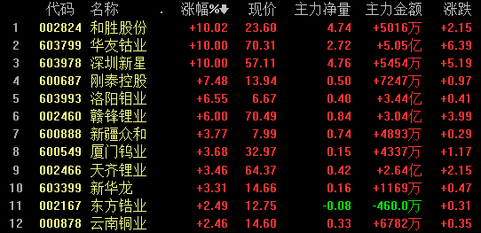 有色板块虽然涨幅不大,但其板块内的标的股已是今天表现最强的群体。和胜股份、华友钴业、深圳新星强势涨停,刚泰控股暴涨7%,洛阳钼业、赣锋锂业均大涨6%以上,新疆众和、厦门钨业、天齐锂业、新华龙、东方锆业、云南铜业等个股亦有不同程度的上涨。
