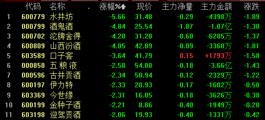 受到昨晚利空的影响,白酒板块成为今天的领跌板块,下跌逾2%。水井坊大跌超5%,酒鬼酒、沱牌舍得、山西汾酒、口子窖均下跌3%以上,五粮液、古井贡酒、伊力特、今世缘、金种子酒、迎驾贡酒等个股亦有不同程度的下跌。